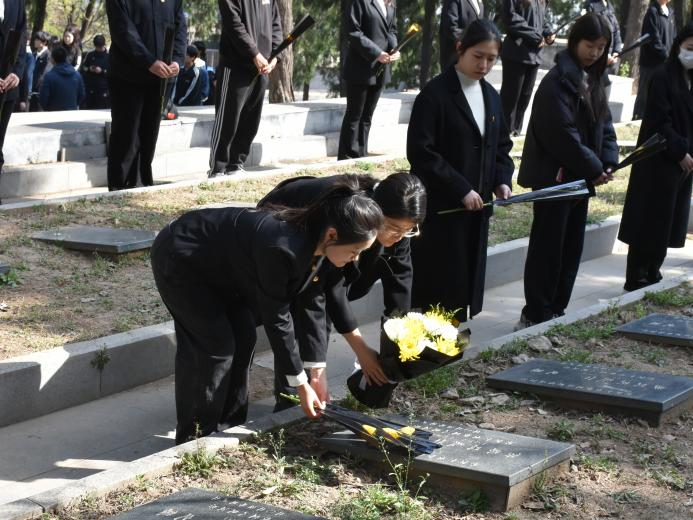 上午10时,活动在肃穆的氛围中拉开序幕。师生们手持白菊,列队缓步走向烈士纪念碑。师生依次上前敬献鲜花,并深深鞠躬默哀。师生们以整齐的队列和凝重的神情,传递对先烈舍生忘死、为国捐躯精神的无限追思。每一朵白菊承载着师生对英雄的感恩,每一步脚印传承着红色的基因。