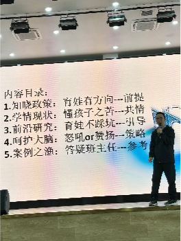 山东女子学院教育学院院长王飞教授以“解读陶行知的《生活即教育》一书”为主线,深入阐释家校社共育的哲学根基——《生活即教育》六篇核心内容浓缩。分别从“信念篇:生活教育的哲学基础、素养篇:教育者的自我修炼、实践篇:行动导向的教育方法论、民主篇:教育中的平等与自由、生活篇:教育与生活的深度融合、儿童篇:解放与发展儿童天性”进行核心观点提炼、陶行知金句摘录,强调以陶行知的“生活教育”理念,回归教育的本质助推我们今天的教育,指出家庭要做好“生活教育”的启蒙者、学校要做好“知行合一”的引领者、社会要做好“教育协同”的支持者,希望各位班主任以“生活”为课堂,关注学生的真实需求,将教育融入日常点滴;以“共育”为桥梁,主动与家长、社区沟通,构建信任与合作;以“创新”为动力,探索家校社协同的新模式,例如开发“家庭成长档案”、组织“社区教育沙龙”等。