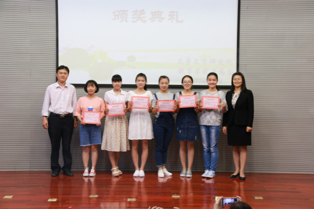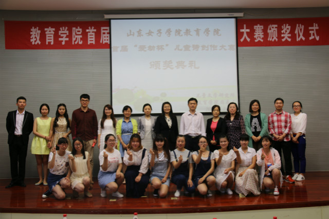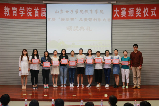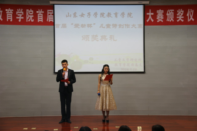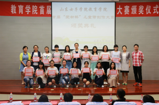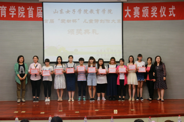 静心湖畔会群贤,女院诗花露新妍。2016年5月19日下午,由教育学院儿童文学研究所、教育学院团总支联合举办的首届“爱幼杯”儿童诗创作大赛颁奖典礼暨优秀选手朗诵展示会在图书馆B座一楼报告厅隆重举行。出席本次颁奖典礼的有教育学院党总支书记田莉春、院长董吉贺,教师代表徐伟、刘海丽、高小焱、王元凯、路敏、王春晓、李娜、陈鹏飞等出席现场,教育学院部分学生也到场参与。