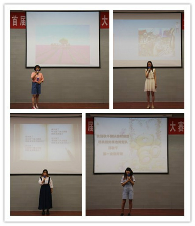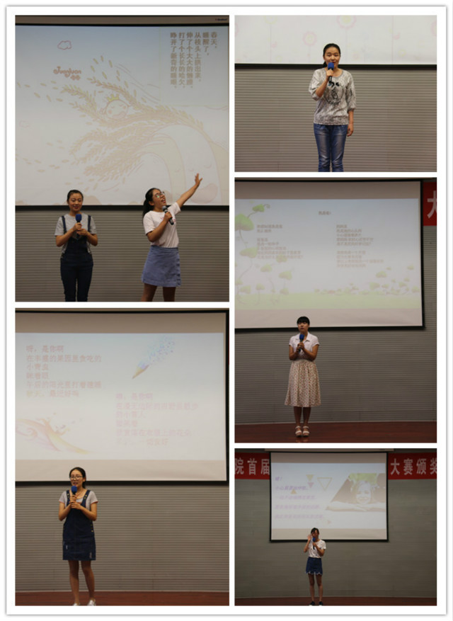 颁奖典礼上,田书记、董院长及老师们分别为获奖选手颁发了荣誉证书并合影留念。随后,党总支书记田莉春致辞,她强调儿童诗创作大赛对推动教育学院优秀人才培养的重要性,并对获奖作品中饱满的儿童情感、儿童式的丰富想象、新颖巧妙的构思以及天真而精粹的语言给予充分肯定,同时勉励同学们崇尚荣誉、积极探索,谱写青春篇章。为充分展示儿童诗的魅力,激发同学们热爱儿童文学写作,学院还组织部分荣获一、二等奖的选手进行现场朗读,悠扬婉转的旋律、唯美精致的幻灯片,和着选手们声情并茂的朗诵,让大家仿佛回到那个童真的年代,感受生命的蓬勃。