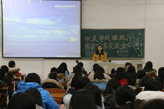 2015年12月10号下午6时,教育学院于2号教学楼207教室召开“优良学风班级、优良学风宿舍”经验分享交流会。学生会副主席赵元主持会议,14级优良学风班级、宿舍成员代表,学生会学习部、生活部部长以及15级班委成员到场参与。 会议伊始,学习部及生活部部长针对目前15级新生的学习和生活状况,介绍了我院优良学风班级以及优良学风宿舍评选标准、注意事项,在思想道德品质、纪律、学习成绩、文体活动以及附加分方面向在场同学提出发展建议。随后,14级优良学风班级、宿舍学生代表以 PPT 为载体介绍所在班级、宿舍的发展情况,从成员分工、日常学习、课外活动、生活等方面总结经验,同时与在座同学进行互动交流,强调团结合作、制定计划、反思总结以及端正态度的重要意义,表示班级、宿舍的每个成员都应该充满正能量,凭借自身实力做一些力所能及的事情。针对以上内容,学生会副主席作结,表明一个班级是否优秀主要得益于班委的共同努力以及全体成员的团结协作,指出舍友之间在学习、生活上要互帮互助,营造良好氛围,同时分享人生格言“只要你还愿意努力,世界会给你惊喜”,鼓励同学们在今后凝心创优。 交流学习,勇攀高峰。此次会议,进一步加强了学生集体主义观念和团结奋进的精神培养,推进学生群体发展以及优良学风班级、宿舍建设,从而创建良好的育人环境,促进学院优良学风建设。