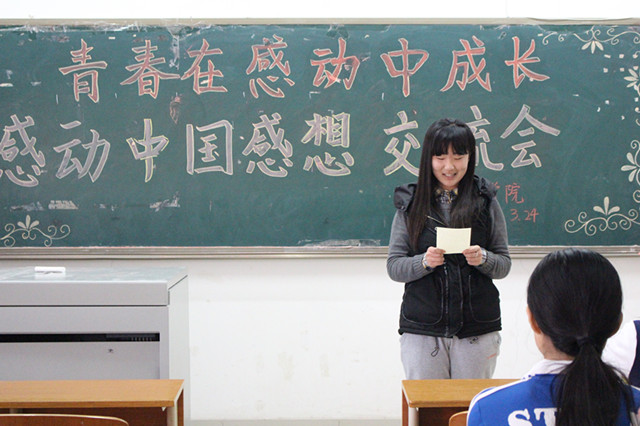 本次主题教育系列活动共分为三个环节,以组织学生观看视频为契机,13、14级各班团支部在2号教学楼308室和310室集体观看2014年感动中国颁奖典礼视频,同学们无不被一位位平凡中的伟人所触动。随后,各班开展“追梦青春·点赞中国”微博线上征集感想活动,同学们踊跃在腾讯微博上分享自己的感触,写下内心对感动中国人物的敬佩。在团总支组织的“青春在感动中成长”感想交流会中,13、14级各团干部围绕“感动中国带来的启示”、“青春共话成长”等话题,畅所欲言、讨论热烈,感动中国人物事迹在同学们心中激起了强烈的共鸣。