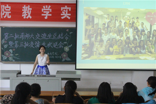 接着,第三批即将赴南师大的代表进行了发言,她首先感谢学校提供的机会,并表示将以自己的实际行动展示我院学生的良好风貌,一定学有所成,决不辜负学校领导和老师的期望。(路敏、学生通讯员陈敏)