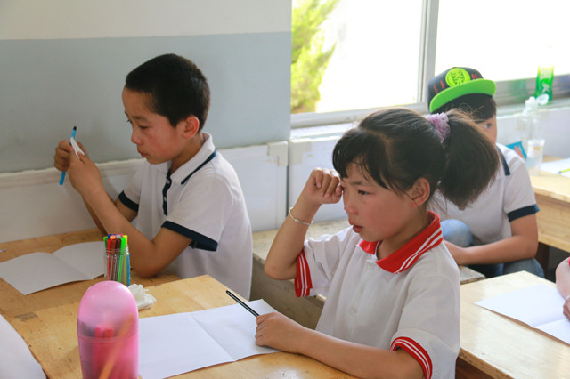 活动后期,围绕“感恩”这个主题志愿者们精心设计了游戏“感恩的心”,孩子们按照志愿者的指示独立完成带有自己父母形象的两幅画。伴着轻柔的音乐,孩子们用稚嫩的小手画下了他们记忆中的父母,并认真分享了他们想要对父母说的话,“爸爸妈妈我爱你们”、“我想你们了”、“你们辛苦了”一句句哽咽的话语,一双双带泪的眼眸都让志愿者们感受到了来自留守儿童的那份思念父母的心情。