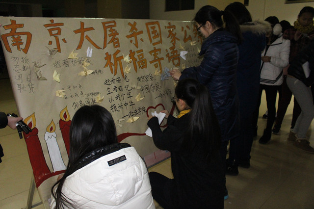 12月13日晚,教育学院还诚邀全校师生参加了烛光祈福活动,在一束束微弱的烛光前,同学们怀着悲恸的心情为死难者祈福,全体同学默哀后,在千纸鹤上纷纷寄语以表达对遇难同胞的哀悼和纪念。“前事不忘,后事之师”,在我国日渐强大的今天,青年学生更应该吸取教训,勿忘国耻,珍爱和平,强化自身素质,为祖国崛起而贡献自己的一份力量。(路敏、张元)