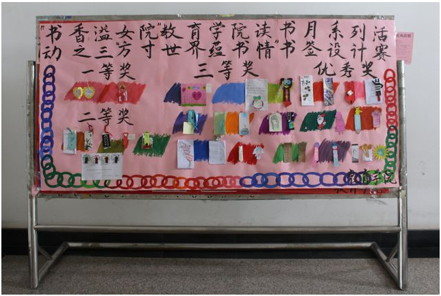 “方寸世界蕴书情”书签设计大赛,是读书月的特色活动。通过书签制作比赛,为学生提供了一个展现想象力和动手能力的舞台,共收到了作品144件,产生一等奖2件,二等奖6件,三等奖10件,优秀奖18件,活动既锻炼了学生的动手能力,又激发了学生的读书欲望,使学生在活动中读书,在读书中成长。除此之外,活动本着建设“书香班级”,营造“文化女院”的宗旨,每个班在开学初制订了班级读书计划,大家围绕专业学习、读书计划、班级活动等方面进行设计,在学期结束时进行完成比照,最终各班进行成果汇报。