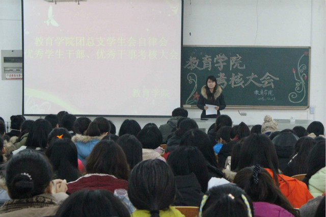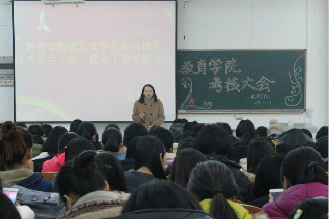 12月23日中午,教育学院于2号教学楼110教室召开了2015年—2016年第一学期团总支学生会学生干部考核大会。本次大会由辅导员王春晓老师主持,出席本次考核会的有教育学院党总支副书记郑全蕾、辅导员李娜、陈鹏飞以及教育学院团总支学生会自律会全体成员。