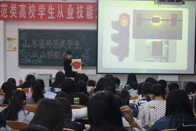 本次比赛以模拟上课为主要评判内容。参赛选手来自学前教育和英语教育(儿童英语方向)两个专业,均是经过初赛的激烈角逐被选取出的佼佼者,其较高的教学水平和较好的专业素养在本次决赛中再一次被完美呈现。学前组参赛选手通过生动的语言、肢体动作以及精美的课件、道具进行了《香喷喷的轮子》、《红绿灯眨眼睛》等教学模拟,于故事讲述中不时穿插儿童游戏、知识问答,以创新的教学思路营造了充满童趣的课堂氛围。小学组参赛选手也不甘示弱,她们在充分发挥英语专业特长,并运用生动形象的情景模拟以及精美的教具将英语课讲述的活灵活现,赢得评委老师的阵阵掌声。选手展示后,评委老师结合实践能力和专业水平作了客观点评,在肯定选手优点的同时也提出了改进的建议。最终,孟维等三名同学荣获学前组一等奖,张作凯、金明丽荣获小学组一等奖,此外还评选出学前组二等奖5名、三等奖9名,小学组二等奖3名、三等奖5名。比赛成绩最佳的3名同学将代表山东女子学院参加第三届山东省师范类学生从业技能大赛省级比赛。