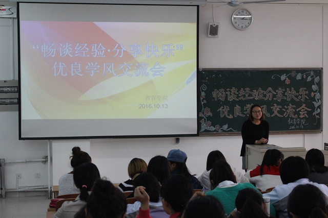 2016年10月13日,教育学院于博文楼210举办了优良学风交流会。14―16级各班班长等代表参加了此次活动。本次会议由副主席贾文玉主持。