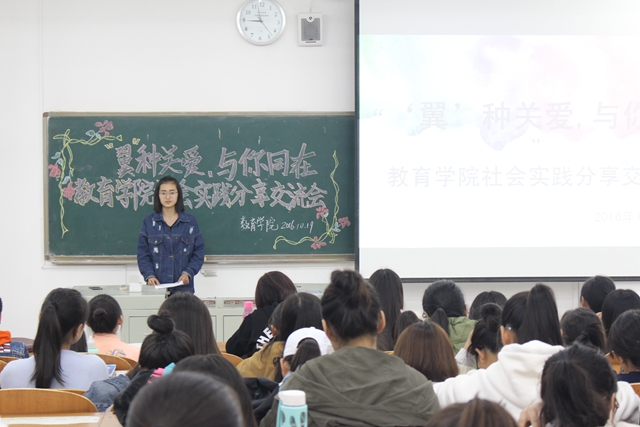 2016年10月19日,教育学院于博文楼108室举办了“‘翼’种关爱,与你同在”社会实践分享交流会,15、16级各班班长、团支书及部分优秀社会实践报告成员代表参加了活动。本次活动由副主席吕巧丽主持。