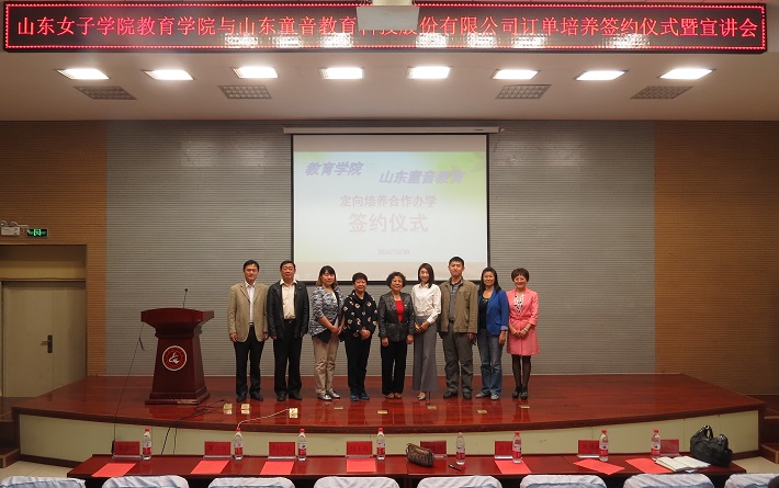 为进一步响应教育部号召,推进山东女子学院与社会教育团体、企业“产学研”合作办学工作,为校企双方提供更为有力的合作共赢的平台与空间,10月20日下午,教育学院在一楼报告厅举办山东女子学院教育学院与山东童音教育科技股份有限公司订单式培养合作办学签约仪式暨童音企业的宣讲会。
