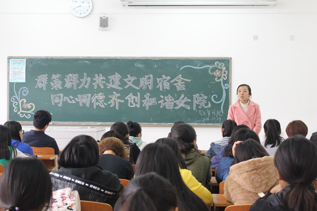 2016年10月24日,教育学院在博学楼302举行了“群策群力共建文明宿舍,同心同德齐创和谐女院”优秀宿舍表彰大会。教育学院团总支书记路敏老师、辅导员李娜老师、陈鹏飞老师以及各班卫生委员、优秀宿舍代表参加了此次活动。