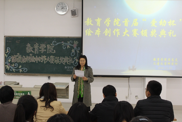 2016年11月3日下午,由教育学院儿童文学研究所、教育学院团总支联合举办的首届“爱幼杯”绘本大赛颁奖仪式在博文楼208室隆重举行。出席本次颁奖仪式的有教育学院党总支书记田莉春、院长董吉贺、董旭花教授、教师代表刘海丽、高小焱、郑艳芹、王元凯、程伟、路敏等出席现场,教育学院部分学生参加了此次活动。