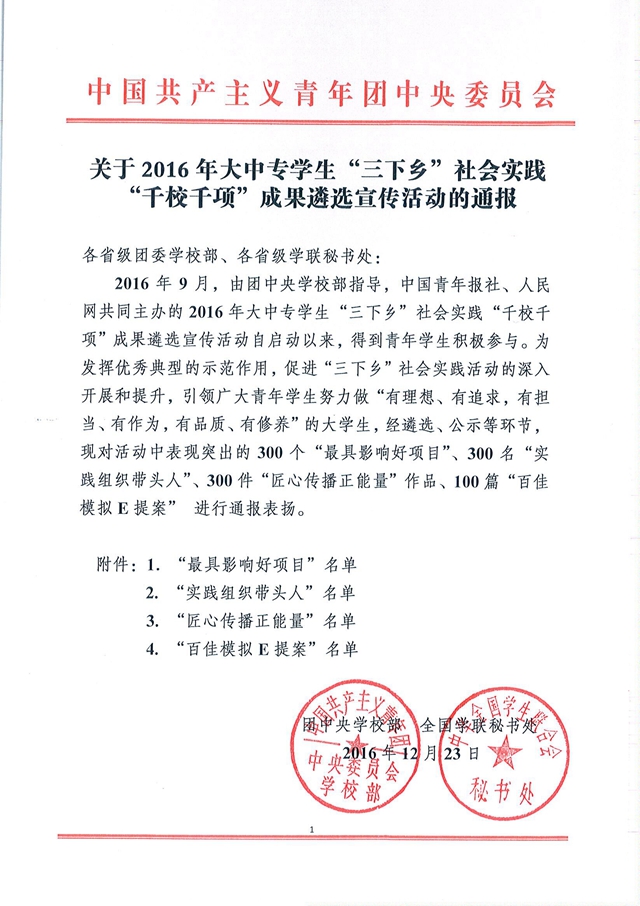 近日,由团中央学校部指导,中国青年报社、人民网共同主办的2016年大中专学生“三下乡”社会实践“千校千项”成果遴选宣传活动名单正式公布。我院“爱之翼”文化宣传服务团关爱留守儿童暑假社会实践项目被评为最具影响力好项目。
