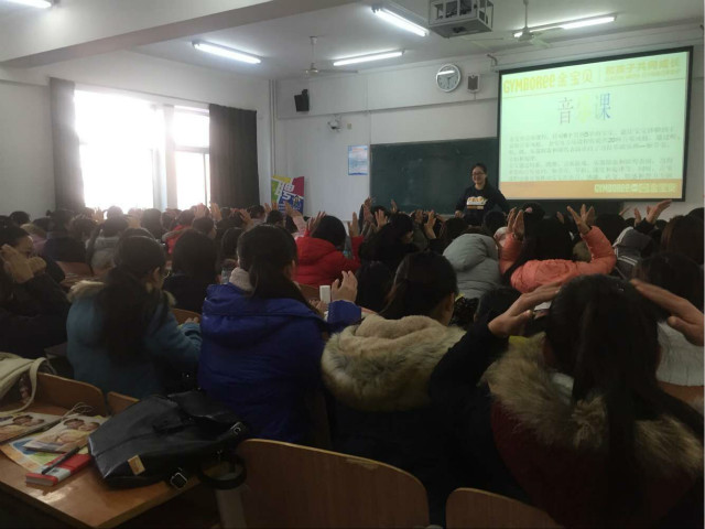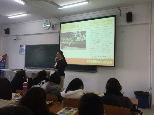 Tina导师为在座的同学们讲解了金宝贝国际早教机构概况。据介绍该结构力求机构给幼儿营造了一个良好的、安全的探索交流的环境,在满足了孩子们身心需求的同时,也给家长提供了许多育儿指导。不仅如此,机构还依据儿童的不同年龄与需求,设计、组织了各类趣味课程及活动,以此来促进幼儿身心的全面发展。 随后,Tina导师又现场为大家模拟展示了机构的音乐、艺术等课程,其生动的讲演和动人的歌声打动了在场的所有学生,不仅开阔了学生的视野,更让大家在观赏中理解了金宝贝早教中心的教学理念:在快乐中学习、游戏+体验=学习、在变化和乐趣中重复、跟随孩子的发育步伐、理解每个孩子的独特性、给孩子“肯定”的环境。其先进的教学理念,让在座的同学们都受益匪浅。在接下来的问答环节中,同学们又结合自身情况提出了诸多就业、择业等方面的疑问,该机构负责导师都一一进行了详细解答,本次会议圆满结束。