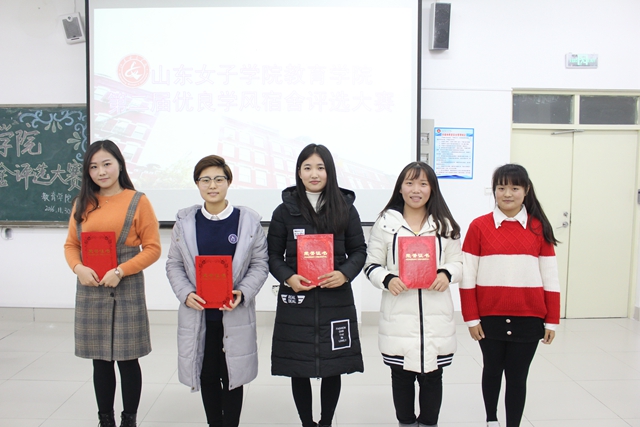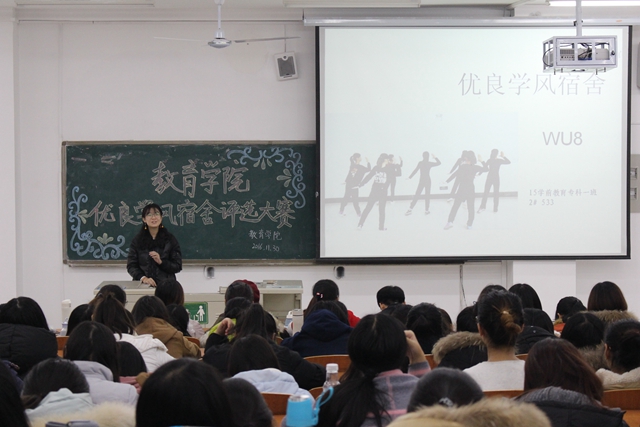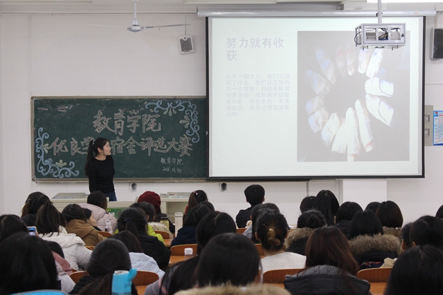 2016年11月30日晚,教育学院于博文楼208室举办了优良学风宿舍评选大赛,担任本次比赛的评委有学生会副主席桑春雨、吕巧丽等以及由各班代表组成的大众评审团。教育学院部分学生观看了本次比赛。