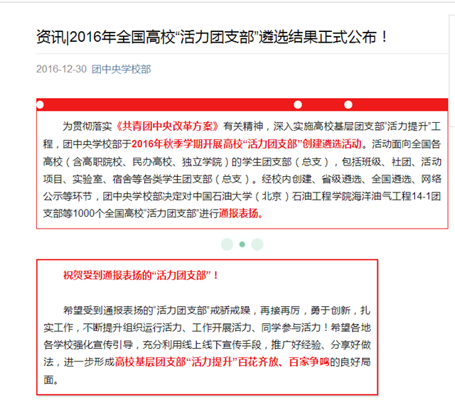 近日,为贯彻落实《共青团中央改革方案》有关精神,深入实施高校基层团支部“活力提升”工程,团中央学校部于2016年秋季学期开展高校“活力团支部”创建遴选活动。经校级推选、省级遴选,资格审核、网络投票和评审等环节,教育学院学前教育本科(国际方向)2014级团支部荣获“全国活力团支部”称号。