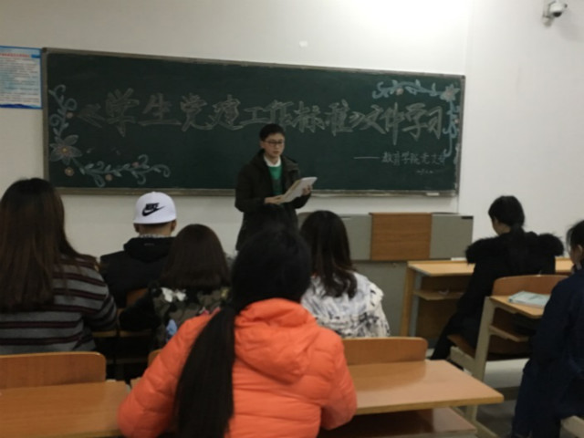 教育学院在校学生党员于2017年3月20日在博学楼108室举行党小组会议,共同学习了《普通高等学校学生党建工作标准》,会议由教育学院2014级预备党员李文慧主持。
