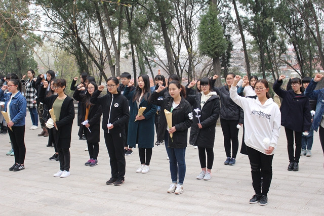 活动伊始,由学生会副主席桑春雨作为代表向烈士致悼词,随后,在主持人的带领下,全体师生宣读誓词“牢记革命前辈们的丰功伟绩,继承革命先烈的遗志……”誓词声声响彻烈士陵园的上空,先烈们为革命事业而献身的崇高精神激励着全场师生。宣誓结束后,全体师生进行了三分钟的默哀,以此缅怀先烈,寄托哀思。之后,师生一行聆听革命烈士事迹并向烈士敬献鲜花。