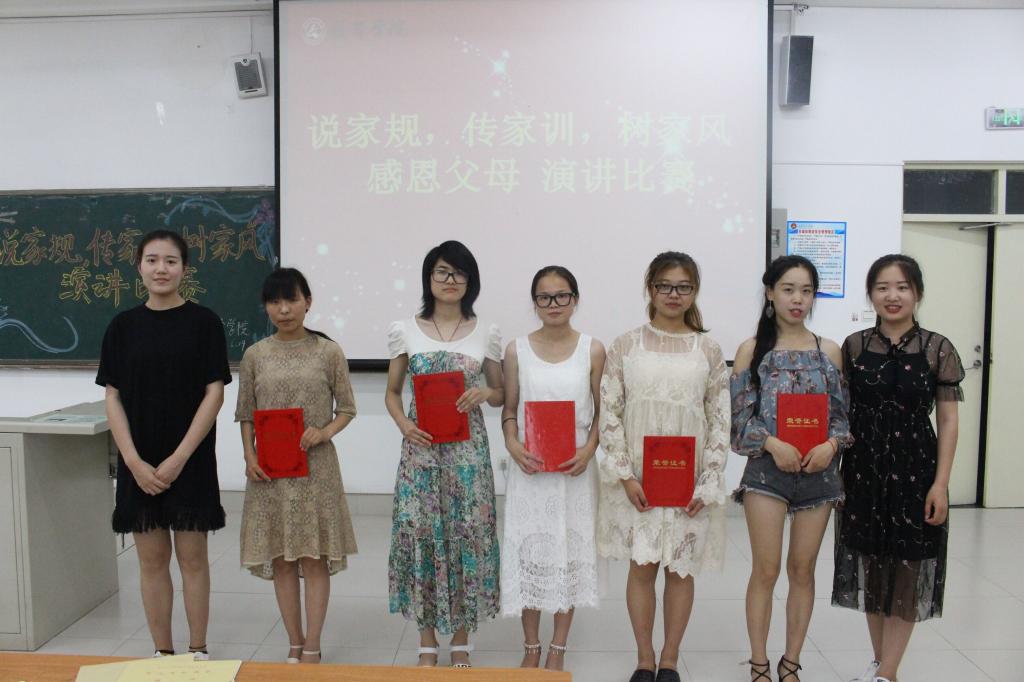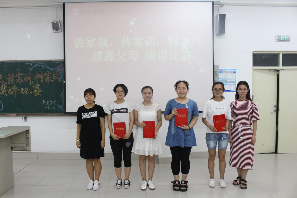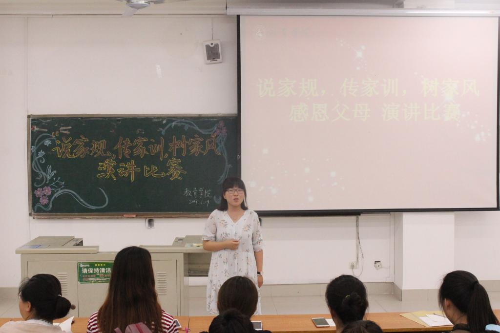 2017年6月19日晚18:30,教育学院于博文楼208举行“说家规、传家训、树家风”感恩父母演讲比赛。此次活动由教育学院记者团影音媒体部主办,教育学院学生会副主席、记者团副团长、网络推广部部长、校广播台播音部部长以及16级部分学生参加此次活动。