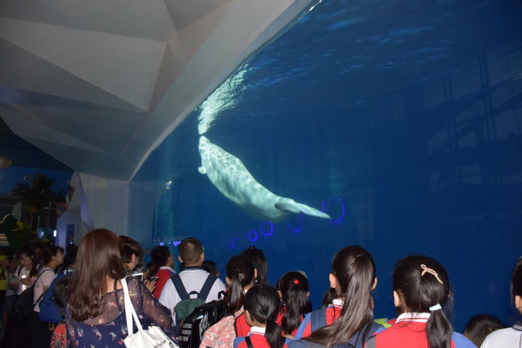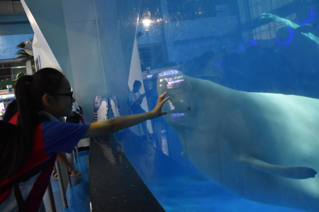 志愿者组织孩子们有序的进行了参观,初进海洋馆,孩子们就发出阵阵惊叹声。志愿者在随后的参观中,给孩子们讲解了相关海洋生物的知识和故事。热带雨林、水帘洞、海龟岛、极地之光、摇摇摆摆的企鹅,憨态可掬的北极熊、绚丽多彩的鱼群,孩子们进入了一个静谧而瑰丽的海洋世界。透过玻璃,孩子们不仅欣赏到了水母、珊瑚、海藻等泛出的点点荧光,在海底隧道也体验到了色彩斑斓的水中视觉效果。最让孩子们欣喜的,还是各种水上表演,美人鱼的故事、激情海底芭蕾表演、憨态的海豹、滑稽的海狮、聪明的海豚吸引的孩子们笑声不断,掌声阵阵。