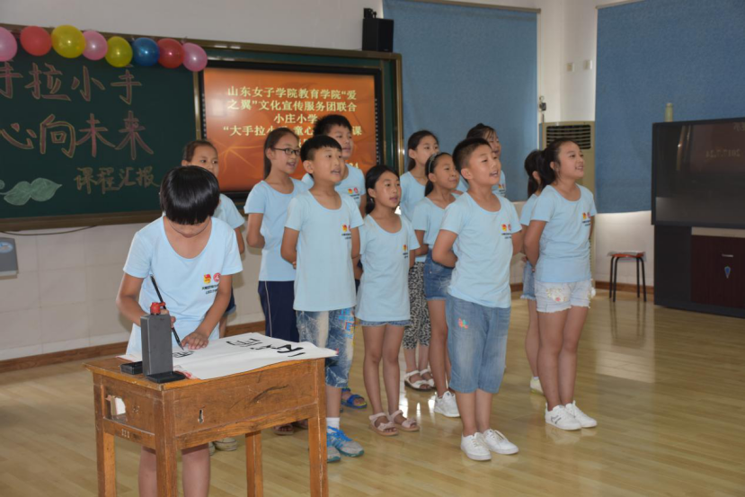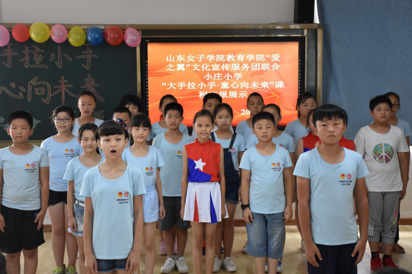 2017年7月24日,山东女子学院教育学院“爱之翼”文化宣传服务团联合小庄小学举行“大手拉小手·童心向未来”课程汇报展示活动,出席此次课程汇报展示活动的有:共青团市中区区委副书记齐巍岩、党家街道党工委副书记聂卉、市中区党家学区教育办主任王静、陡沟街道小庄小学校长赵燕,山东女子学院学生处、教育学院、经济管理学院党总支负责人,带队教师、“爱之翼”文化宣传服务团的志愿者及小庄小学部分学生参加了此次活动。
