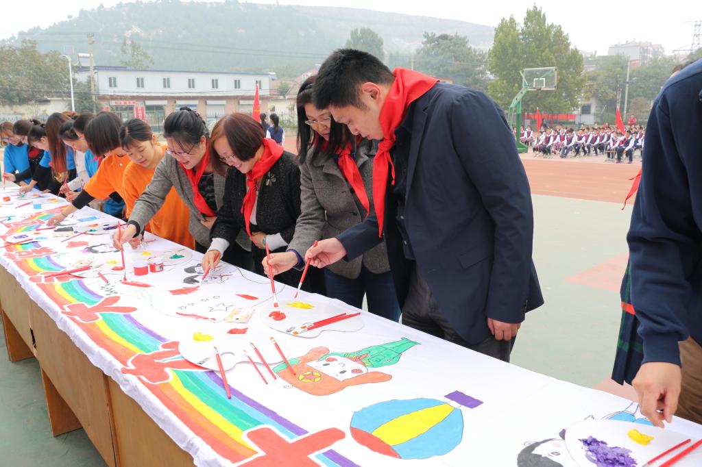 伴随着庄严的国歌响起,全场肃立,迎着朝阳,鲜艳的五星红旗冉冉升起,迎风飘扬在小庄小学的上空。志愿者和小学生代表共同朗诵《大手牵小手·永远跟党走》,表达了志愿者与小学生共同沐浴在党的阳光下携手共进、共同成长的心声。国旗下,小庄小学校长深情寄语,为十九大献礼致辞,号召少先队员们积极行动起来,勤奋学习,不断进步,为学校、为家乡、为鲜艳的红领巾增添光彩。随后,参加活动的各位领导、学院志愿者和小学生们共同绘就“喜迎十九大 共绘中国梦”的巨幅画卷,抒发对祖国的热爱和对十九大即将胜利召开的期盼。