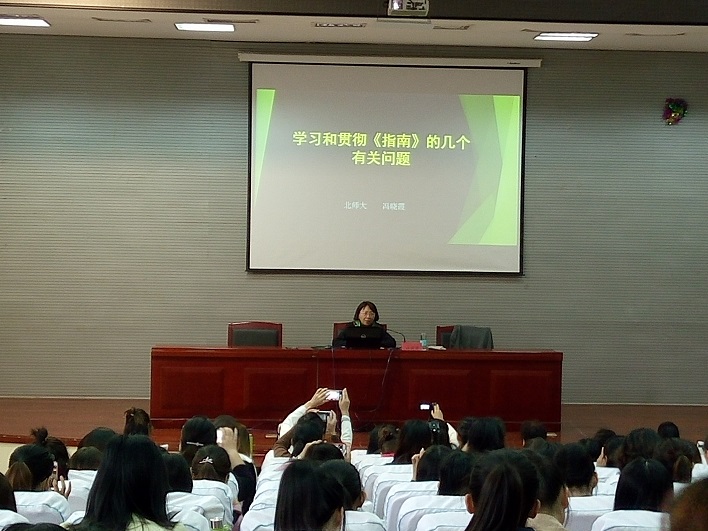 10月16日上午,北京师范大学教育学院教授,博士生导师冯晓霞在学校图书馆一楼报告厅做了题为《学习和贯彻<指南>的几个有关问题》的学术讲座。山东省骨干幼儿教师、教育学院教师以及学前教育专业的100多名同学聆听了此次讲座。