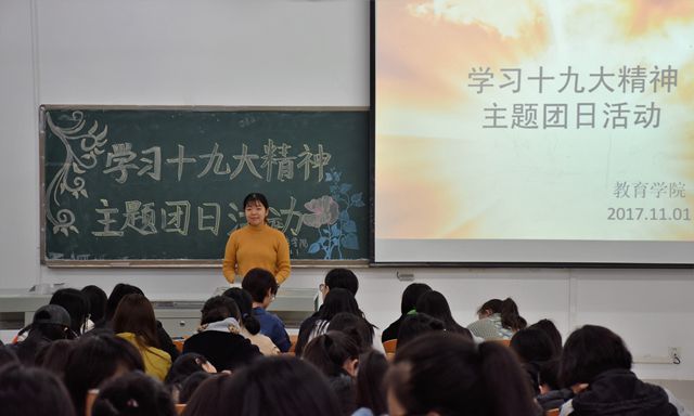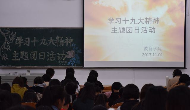 2017年11月1日晚19:20,教育学院于博文楼101开展学习十九大精神主题团日活动,参加此次活动的有:学生会主席吕巧丽、团总支副书记贾文玉以及部分16、17级学生。本次活动旨在教育学生明确规范自己的行为,贯彻落实十九大精神。