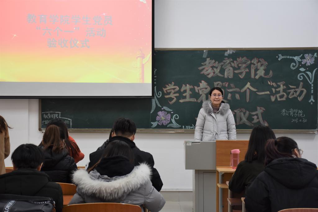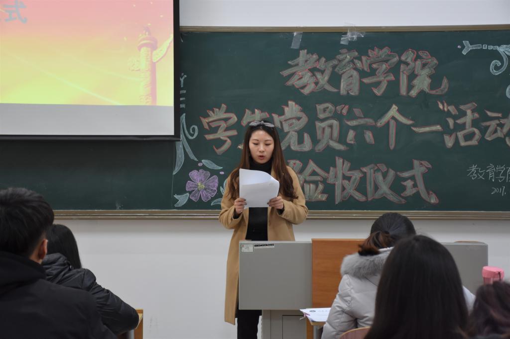 2017年11月30日下午,教育学院学生党支部于博学楼110举行了“教育学院学生党员‘六个一’活动验收仪式”。活动由教育学院党支部书记王春晓主持,党支部学生党员参加会议。
