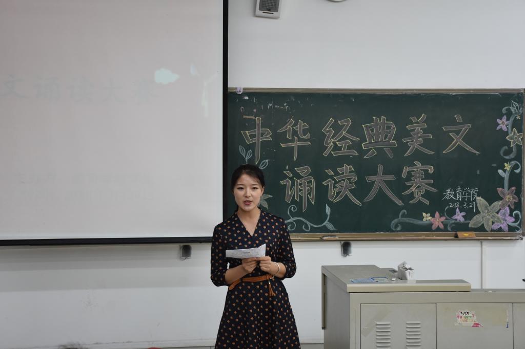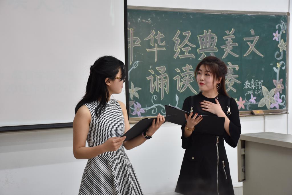 2018年3月29日,教育学院于博文楼210举办了中华经典美文诵读大赛。本次大赛由教育学院记者团负责,担任本次比赛的评委有:教育学院记者团副团长李佩璇及各位部长。