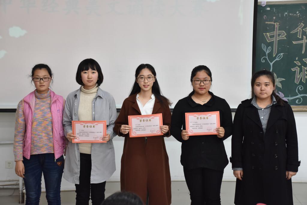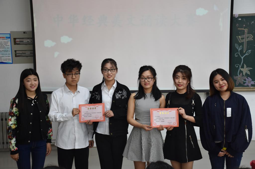 主持人在介绍比赛流程及评分标准后,活动正式开始。伴随着优雅动听的配乐,同学们声情并茂地朗诵着经典美文。《满江红》中“抬望眼,仰天长啸,壮怀激烈”,句句都让人感受到岳飞的爱国情怀;由王泉钧带来的《大学》中,浓厚的儒家文化特色,提醒着我们传承中华文化;《趵突泉》更别具特色,不仅古色古香动人心弦,而且结合了济南特色,表现了独具济南韵味的文化;《我的南方和北方》中两个朗诵者含情脉脉,用眼神传达感情,美不胜收;《红高粱》用抑扬顿挫的语调,那喷薄而出的感情呼唤强有力的生命形态,呼吁中华民族要自尊自强,赢得了观众的阵阵掌声。 最终,本次比赛共选出一等奖两名、二等奖三名、三等奖五名、优秀奖十名,并由评委们为各位获奖同学颁发荣誉证书。