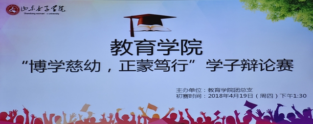 4月19日下午,教育学院于博雅楼B202室举行“博学慈幼·正蒙笃行”学子辩论赛。本次辩论赛由教育学院团总支主办,是“北大山教育论坛”系列活动之一。比赛特邀了郑艳芹、王元凯、李绍妮、陈鹏飞四位老师以及学校辩论社社长担任评委,教育学院部分同学参加了此次活动。
