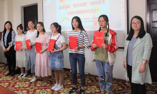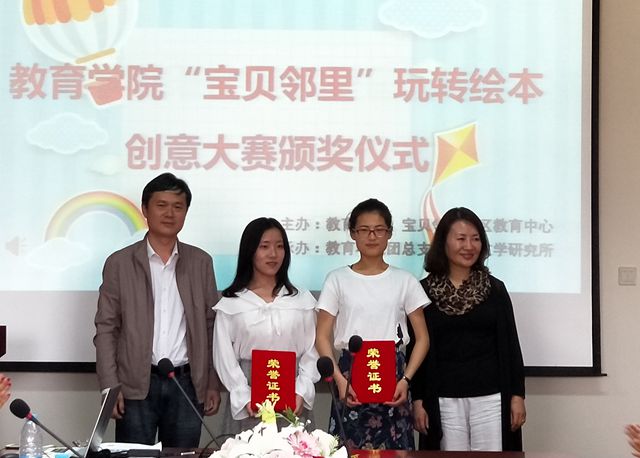 点评结束后,宝贝邻里社区教育中心总经理柴红表示他们一直坚信“同样爱孩子,我们更专业”的理念,对教育学院同学们专业的态度给予认可,相信此后会有更加美好的作品呈现给孩子。教育学院院长董吉贺最后发言。他首先向本次活动的成功和获奖的同学表示祝贺,并指出根据学校办学定位,教育学院一直致力于应用型人才培养,不断完善人才培养方案,加强课程建设,提高学生的专业技能和实践能力,校企深度合作就是一种很好的育人形式。本次玩转绘本创意制作大赛将社会需求与专业教育相结合,取得了良好的效果,同学们在比赛中所展现出来的专业素养和创新能力也令大家倍感欣喜。他希望下一步双方本着“互惠共赢”的原则,继续搭建高水平合作平台,多出高水平合作成果。最后,领导老师为获奖学生颁发了奖状,并合影留念。