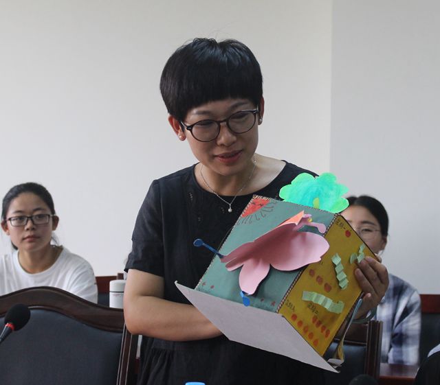 首先,刘海丽老师宣读了获奖名单。随后,部分获奖学生进行作品展示。15级学生岳圣苒讲述了根据幼儿年龄特点,设计半立体书《我只爱你》的过程,她通过视觉上的冲击,直观触碰的方式、灵动的语言将故事生动的再现,激发孩子用眼去看,用手去动,用大脑去思考探索。在座各位领导老师给予同学们高度评价,对同学们的努力表示肯定。宝贝邻里教研总监权尊花、教育学院董旭花教授、高红星教授对作品进行了点评,提出自己的建议。