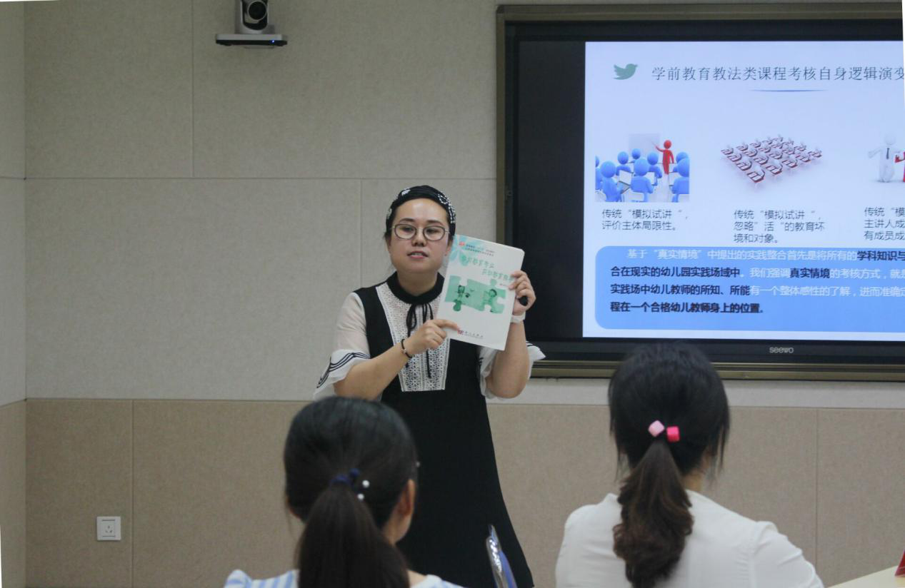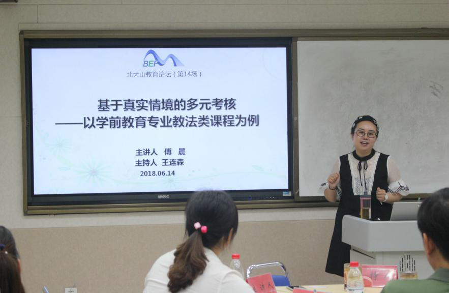 2018年6月14日,论坛迎来了第一次教学研习会——教育学院学前教育专业教研室傅晨副教授就学前教育专业教法类课程如何考核的问题,做了题为《基于真实情境的多元考核》的报告。