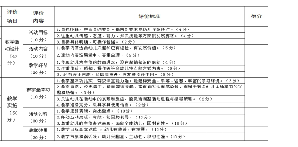 从评分标准中可以清晰地看出,评价内容不仅包括教学活动设计(活动目标、活动内容、教学环节),还包括教学实施(教学基本功、活动过程和教学效果)等能力方面的评价。