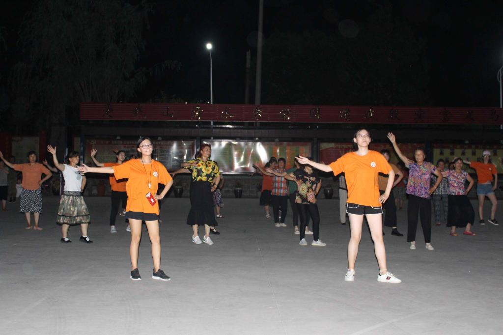 夏夜,微风,蝉鸣,疲惫忙碌了一天的村民和志愿者们在晚上相约广场。“没跳广场舞之前,每天就在家带着看电视,现在不一样了,吃完饭就出来约在一起活动,只要天气允许,都会来跳广场舞,因为不仅可以锻炼身体,还能愉悦身心。”一个阿姨对志愿者说。志愿者们在前期经过精心的广场舞挑选、学习、排练,并在广场上“大展身手”一番。广场舞阿姨们将志愿者精心排练的广场舞与她们自己的音乐轮流播放,志愿者们耐心教导并且虚心向阿姨学习,其乐融融,伴随着音乐的律动,志愿者们也相继舞了起来。