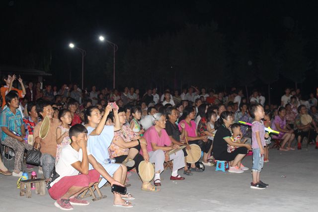 各位志愿者准备就绪,音响在进行最后的试音。有些孩子坐上了石头,摇头晃脑,好奇地打量着舞台。老人们坐在自带的小马扎上,摇着蒲葵扇,有说有笑,等待着节目的开始。健美操作为开场舞,将舞台气氛点燃。