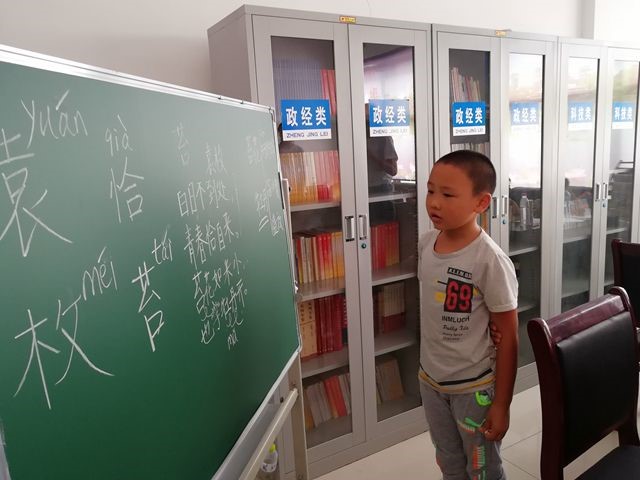 志愿者在对孩子进行了初步了解后,按照年龄分成两组进行组织活动。国学课上,志愿者为孩子们讲解了清代诗人袁枚的《苔》,在对个别生僻字进行教导指正后,孩子们两两一组配合着大声朗诵起来,并在课堂末尾展示了自己的朗诵成果。