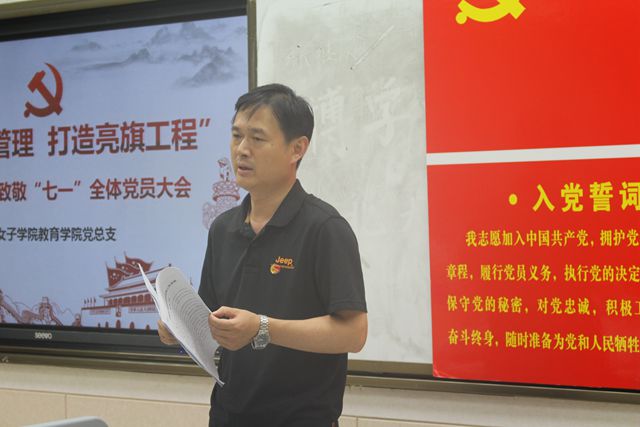 为纪念中国共产党成立98周年,进一步增强基层党组织的凝聚力和战斗力,发挥党员干部的先锋模范作用,6月20日,教育学院党总支召开“推进教育管理 打造亮旗工程”——致敬“七一”全体党员大会。会议由教育学院党总支副书记崔江宁主持。