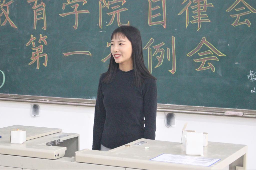 会议伊始,李绍妮老师首先对新加入学生会、自律会的干事表示了祝贺,同时也提出了更高的要求。老师指出,作为学生干事要有清晰的自我定位,知道“应该做、能做、不能做什么”;要树立责任意识和担当意识,发挥好模范带头作用,以点带面,正向引导,弘扬教育学院的优良学风;要处理好人际关系,与同学和睦相处、共同进步。最重要的是,老师叮嘱同学们要牢记初心,保持工作热情,保证工作效率,表达了对19级各位干事的期望和鼓励。