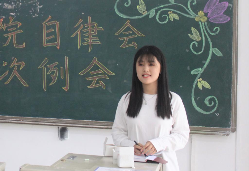 自律会主席景韵针对值班和请假等相关事项对干事们提出了进一步要求,着重强调礼貌和纪律问题,要求学生干事要严于律己,从自身做起,遵守校规校纪,争做校园榜样,促使干事们意识到在以后的工作中需要不断严格要求自己,以积极的心态参与到自律会的各项工作当中。