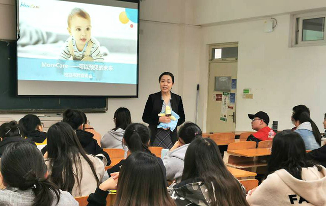 宣讲会开始,主讲老师们向同学们介绍了MoreCare的教学理念——“养、教合一”的通识教育,即在宝宝的日常生活照料过程中融入教育的元素,基于宝宝的兴趣,添加英文、科学、绘本、体能、艺术、音乐、文化、社交等游戏化的通识课程。紧接着,老师介绍了MoreCare茂楷婴童学苑的目标“培养有幸福能力的人”,即注重培养孩子身心健康、懂得爱、敢想能做、会社交、有边界感的五项特质,以及安全感、表达尊重、规则、自理等十大能力,从而为孩子奠定一生幸福的基石。老师也为同学们展示了学校环境、教师准则、职业素养培训、外送培训等,并表示MoreCare将为年轻的同学们提供更多的发展环境与挑战自我的机会。最后,人力资源部老师以ppt的形式就MoreCare的部分规章制度、福利待遇、企业文化、现有产业分布、人文关怀等做了详细介绍,并现场解答了同学们的疑问,赢得了现场同学们热烈的掌声。