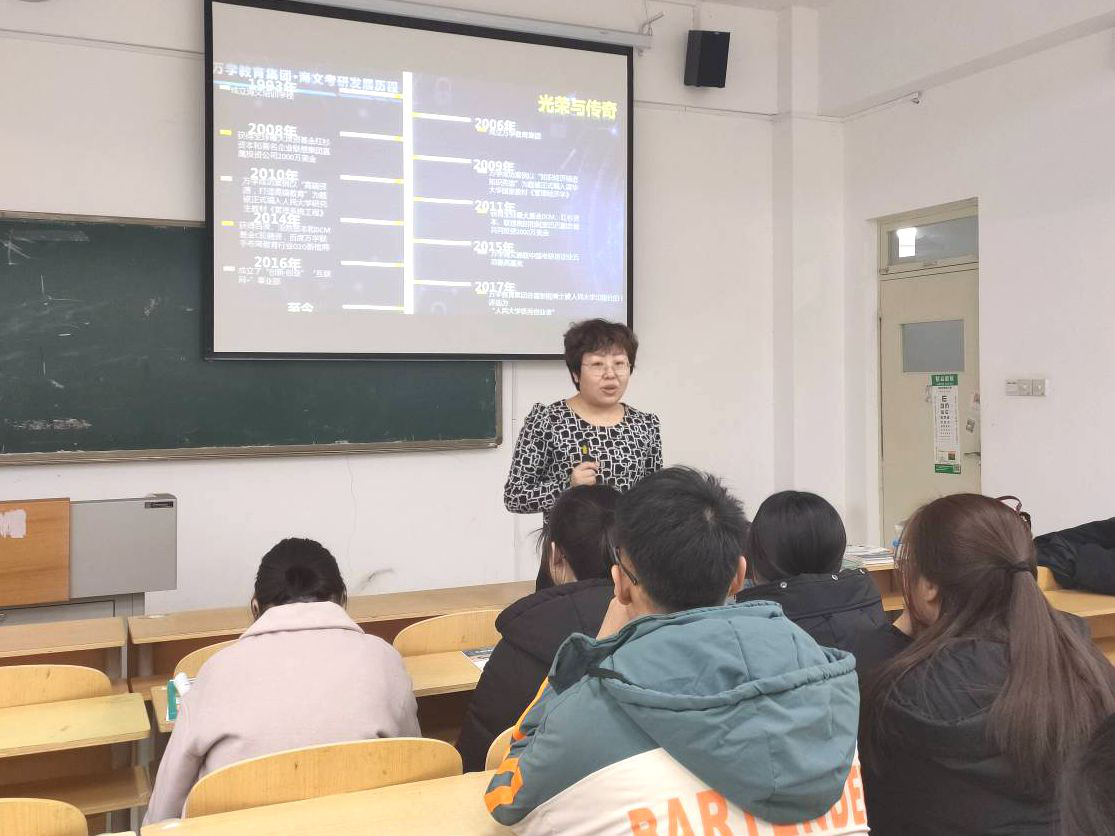 蔺老师接着叙述了万学集团海文考研的发展历程。海文考研自1993年成立后不断发展壮大,现已成为国内优秀的教育集团。她向到场学生展示了万学教育及其创始人取得的成就,又列举了往届优秀学员的例子,分享他们的成功经历和在教育方面的建树,体现出万学教育集团拥有的广阔前景。蔺老师又向学生们简洁地介绍了集团的企业文化,包括不断学习和提高,不断获得属于自己的成就感等等。