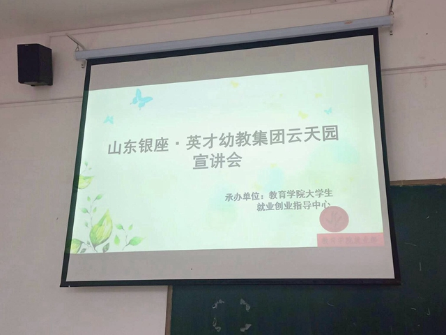 2019年12月12日,14:00,教育学院于博学108召开宣讲会。山东银座.英才幼教集团云天园的老师们和19级学生代表参加了此次宣讲会。
