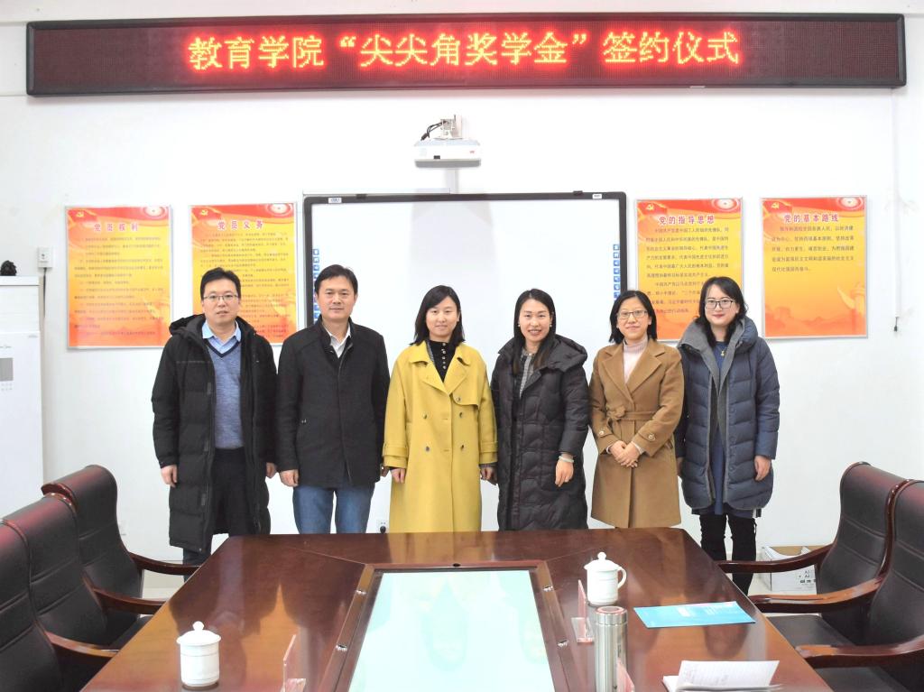 2019年12月20日下午,教育学院隆重举行“尖尖角奖学金”签约仪式。尖尖角幼儿园园长殷晓珊、副园长范方颖,教育学院院长董吉贺、党总支副书记崔江宁、副院长李高波出席了签约仪式。辅导员代表和部分学前专业学生代表参加了签约仪式。