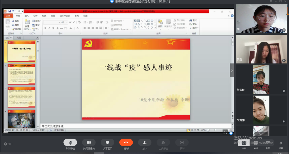 2018级党员代表李珊、李源、李秋梅对一线战“疫”感人事件进行讲述,老将彭志勇、小兵胡龙霞、党员突击队员黄甜,一张张请愿书,一个个红手印,平凡而又真实,一同拼绘成一面面鲜红的党员突击队旗。一个个催人泪下的故事都展示了关键时刻共产党员的使命与担当。2016级党员代表孙娜、于凯丽、孙乐琪,2017级党员代表张梦琪和尚悦、2018级党员代表李凤月,作为近期积极参与志愿服务的学生和家属代表,讲述了她们的经历和感受。孙娜说:“当自己做志愿者工作的时候,感觉自己不再只是一名学生,更是一名中共党员。每个人的力量是有限的,但只要我们万众一心、众志成城,就能汇聚成强大的中共力量,坚决打赢疫情防控阻击战!”李凤月说:“作为一名大学生党员,我时刻谨记学校对我们的教导,在最困难的时候冲在最前面,心系人民群众。家乡养育我长大,我为家乡贡献自己的一份力量。希望病毒早日销声匿迹,还我街头万家灯火,人民得以幸福安康!”