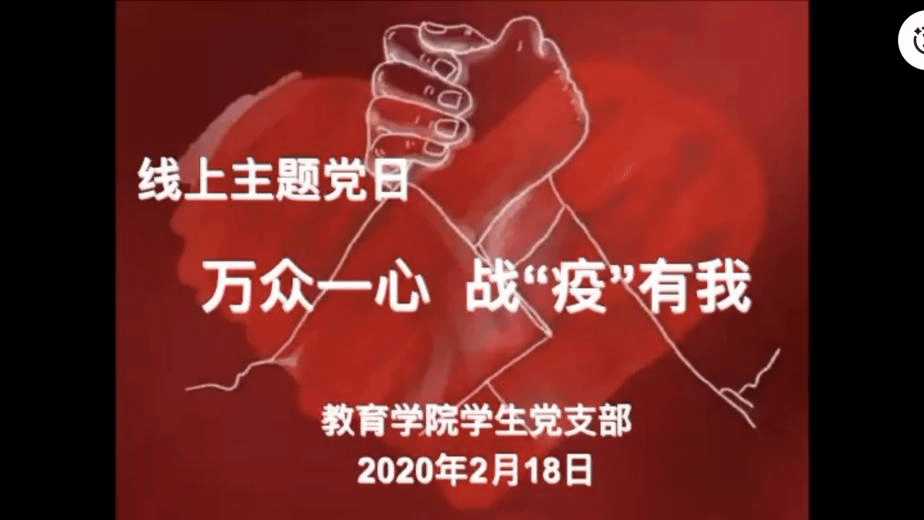 为深入学习贯彻党中央关于应对新冠肺炎疫情的重要战略部署,落实学校疫情防控任务,扎实做好疫情防控期间的学生教育管理服务工作,充分发挥学生党支部的战斗堡垒作用和学生党员的先锋模范作用,2月18日,教育学院学生党支部采取视频会议方式开展了“万众一心,战‘疫’有我”线上主题党日。学生党支部全体师生党员参加,会议由学生党支部书记王春晓主持。