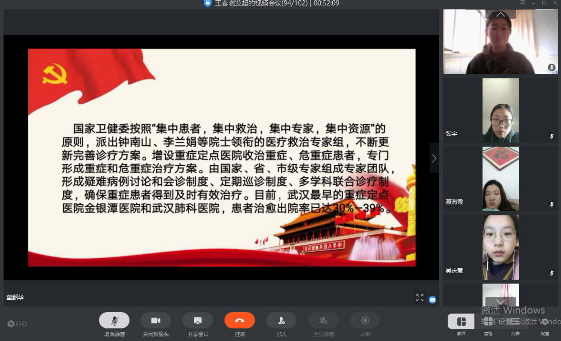 本次线上主题党日学习内容共分为五个环节。首先,党支部书记带领全体党员学习了2020年第4期《求是》杂志刊登的习近平总书记重要文章《在中央政治局常委会会议研究应对新型冠状病毒肺炎疫情工作时的讲话》。随后,2017级学生党员代表孙志新、刘梦凡介绍了当前党中央应对疫情的相关部署:全国一盘棋驰援湖北、千方百计增强收收治能力,联防联控群防群控、“一省包一市”、压实“菜篮子”市长负责制等有效举措,增强了全国人民战胜疫情的信心。2019级党员代表董韶华介绍了湖北省和武汉市抗击疫情相关情况:医疗救治进展和治愈情况、火神山雷神山和方舱医院的建设、军队和各省对湖北省19市的对口支援、“五个百分之百”拉网式大排查等措施和阶段性成效。